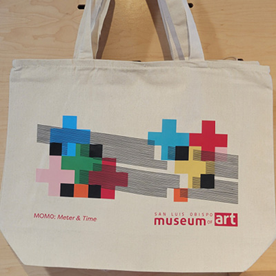 This natural canvas tote features the “overlapped crosses” motif from MOMO’s mural covering SLOMA’s building, Meter & Time. You can see the image in real life on our exterior west wall along Broad Street!